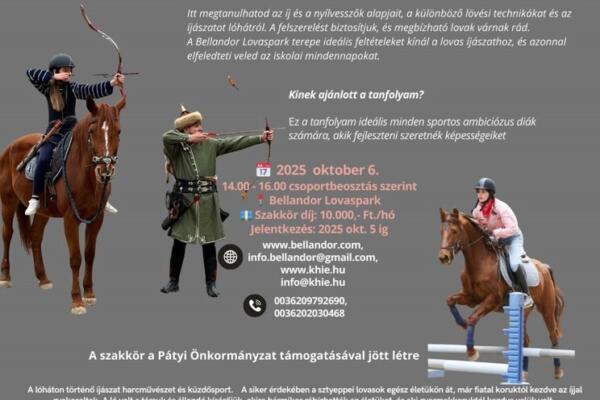 Kezdő lovas, lovaglás és íjászat szakkör indul a Bellandor Lovasközpontban az önkormányzat támogatásával októbertől, részletek a kiírásban.