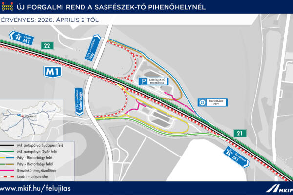 Új forgalmi rend lépett életbe a Sasfészek-tó pihenőhelynél 2026. április 2-tól az MKIF Magyar Koncessziós Infrastruktúra Fejlesztő Zrt. tájékoztatása szerint a Budapest és a Győr felé vezető pályaoldalon is az alábbiak szerint: